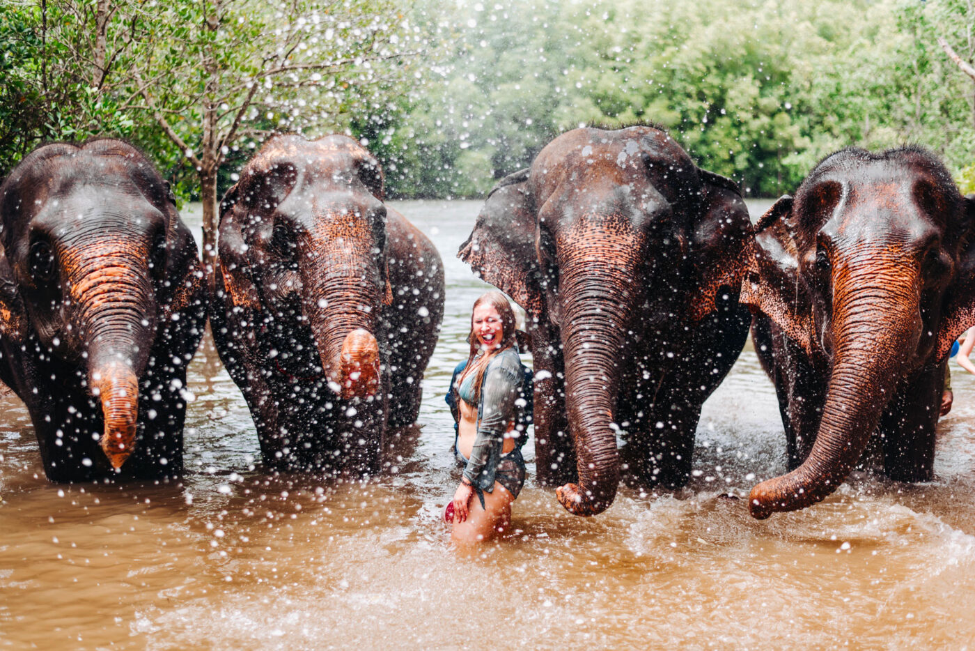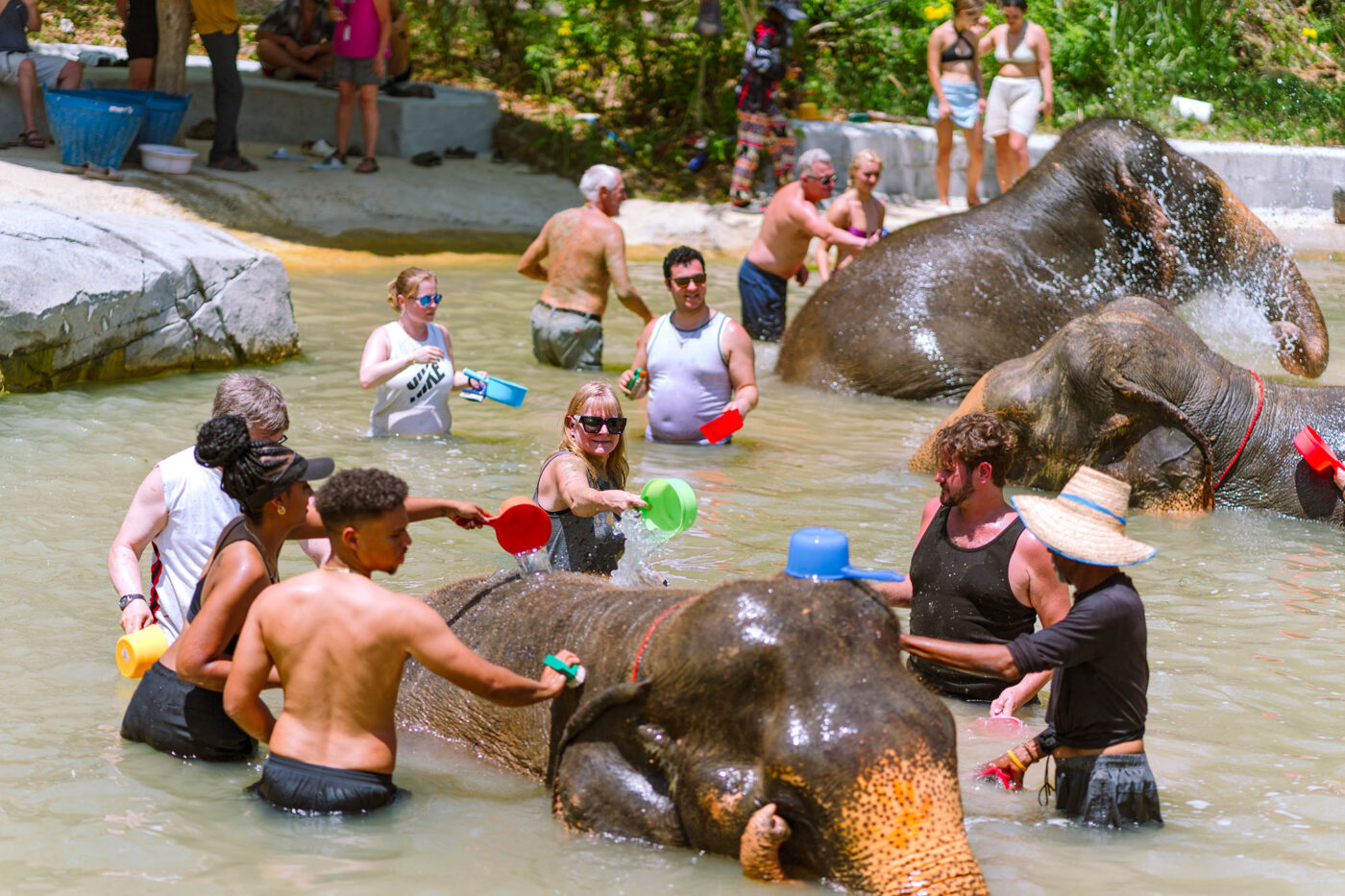 Next, join the elephants for a refreshing mud spa. Elephants love covering themselves in mud to cool down and protect their skin. You’ll get the chance to join them, play in the mud, and even rub it gently on their backs. Afterward, walk with them to the river for the highlight of the day: elephant bathing. Together, you will wash off the mud, splash water, and watch the elephants play happily in the water.